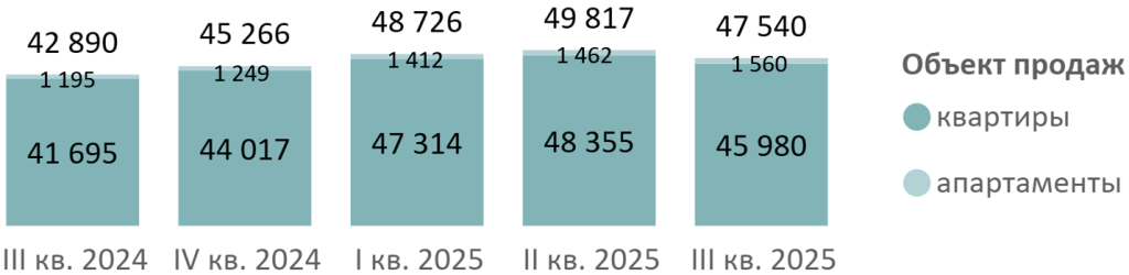 В III квартале 2025 года на рынке новостроек Московской области было зарегистрировано 10,9 тыс. ДДУ (+14% за квартал, +20% за год). В сентябре было зарегистрировано максимальное число сделок (3,9 тыс. ДДУ), минимальное – в июле (3,5 тыс. ДДУ).